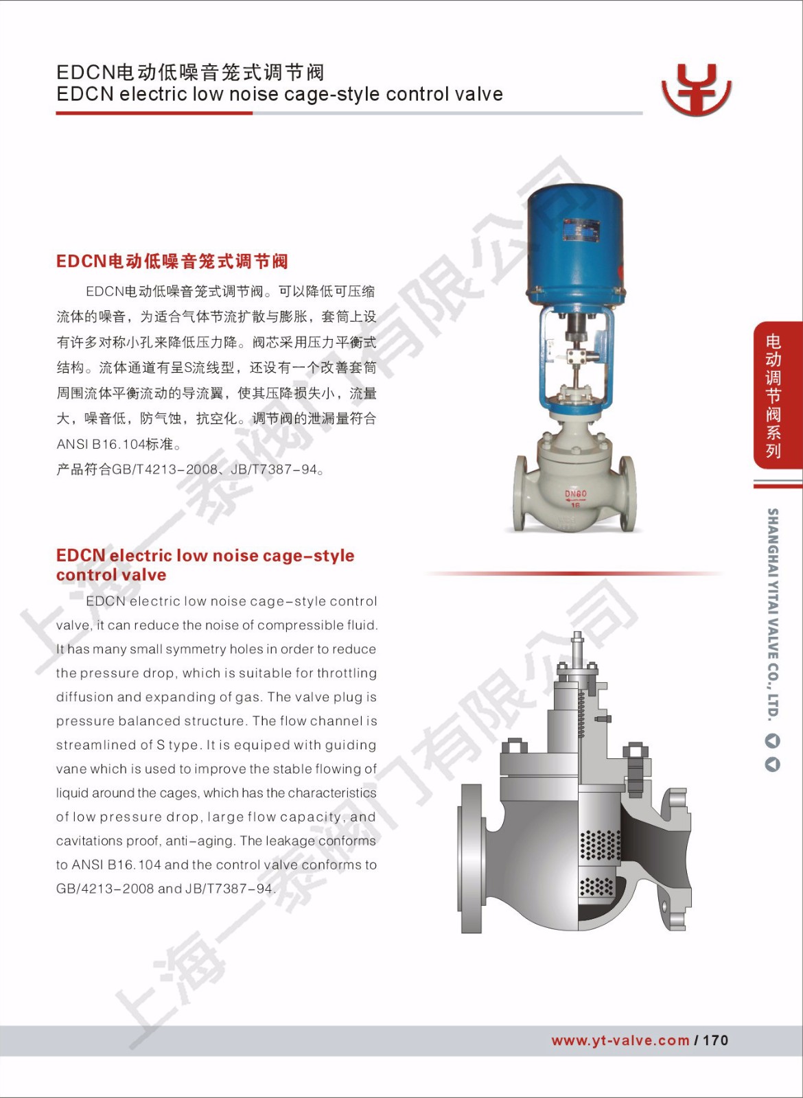 上海一泰阀门有限公司生产的电动低噪音笼式调节阀可以降低可压缩流体的噪音,为适应气体节流扩散与膨胀,调节阀套筒上有许多对称小孔来降低压力降。阀芯采用压力平衡式结构。流体通道有呈S流线型,还设有一个改善套筒周围流体平衡流动的导流翼,使其压降损失小、流量大,噪音低,防气蚀,抗空化。