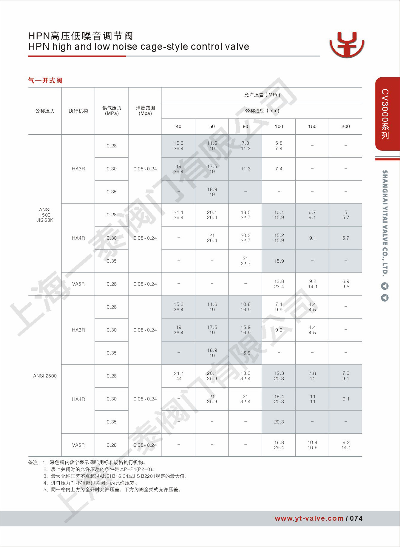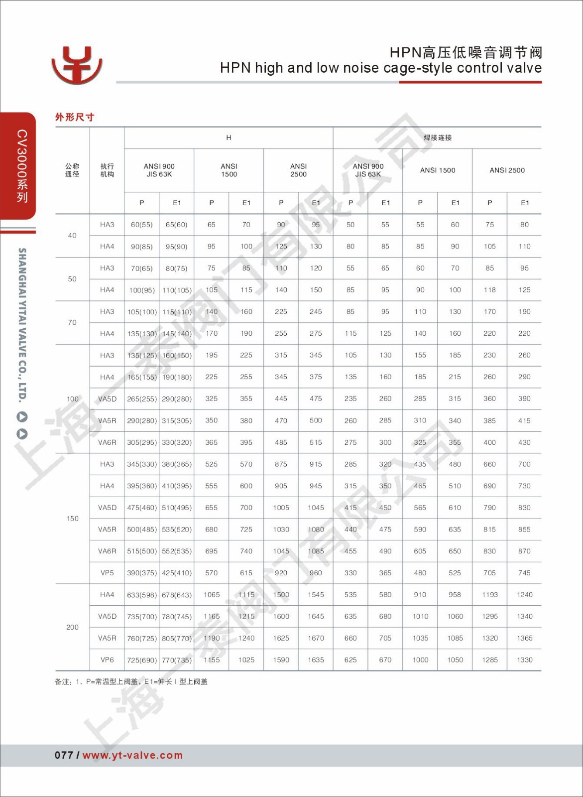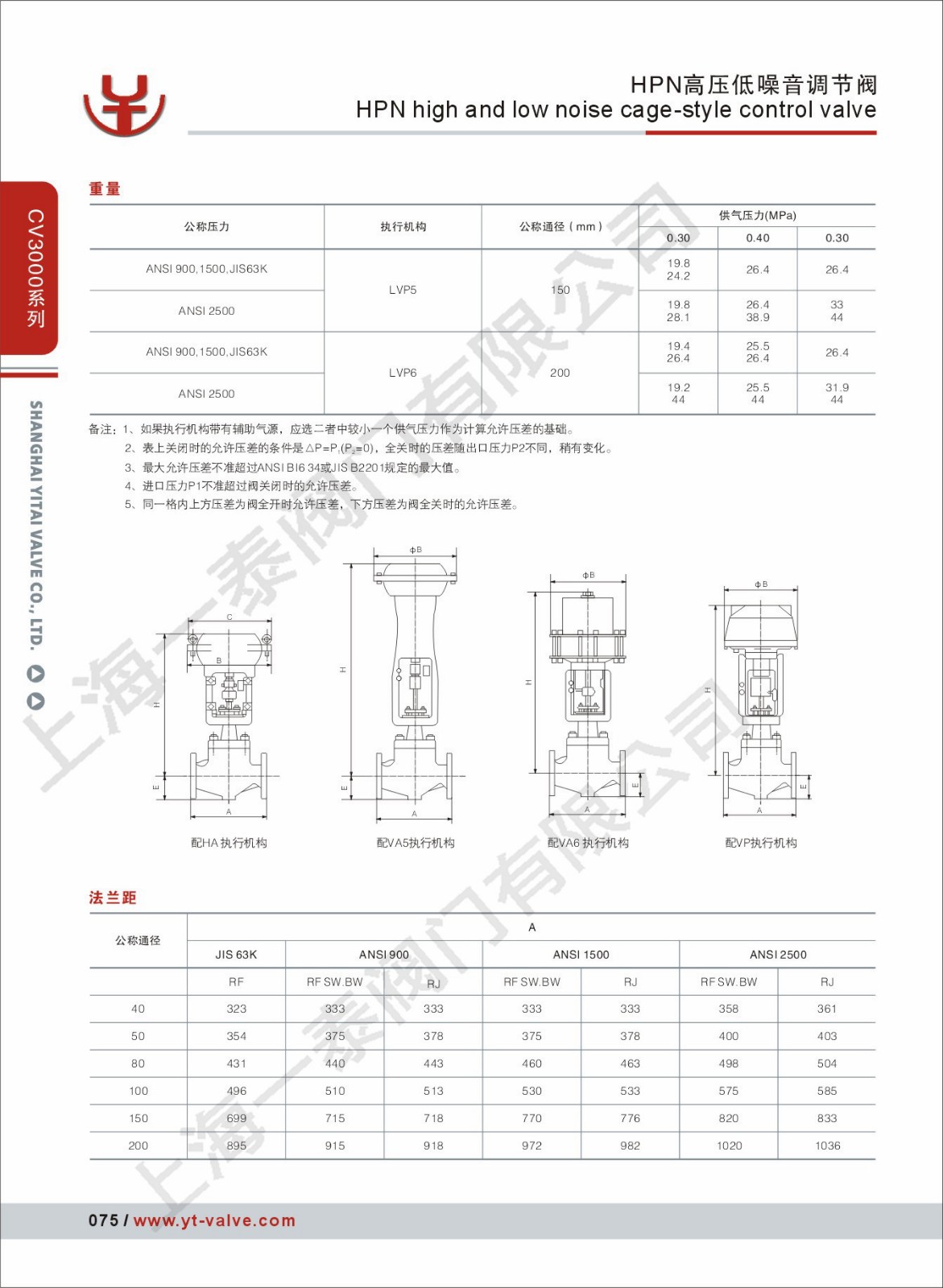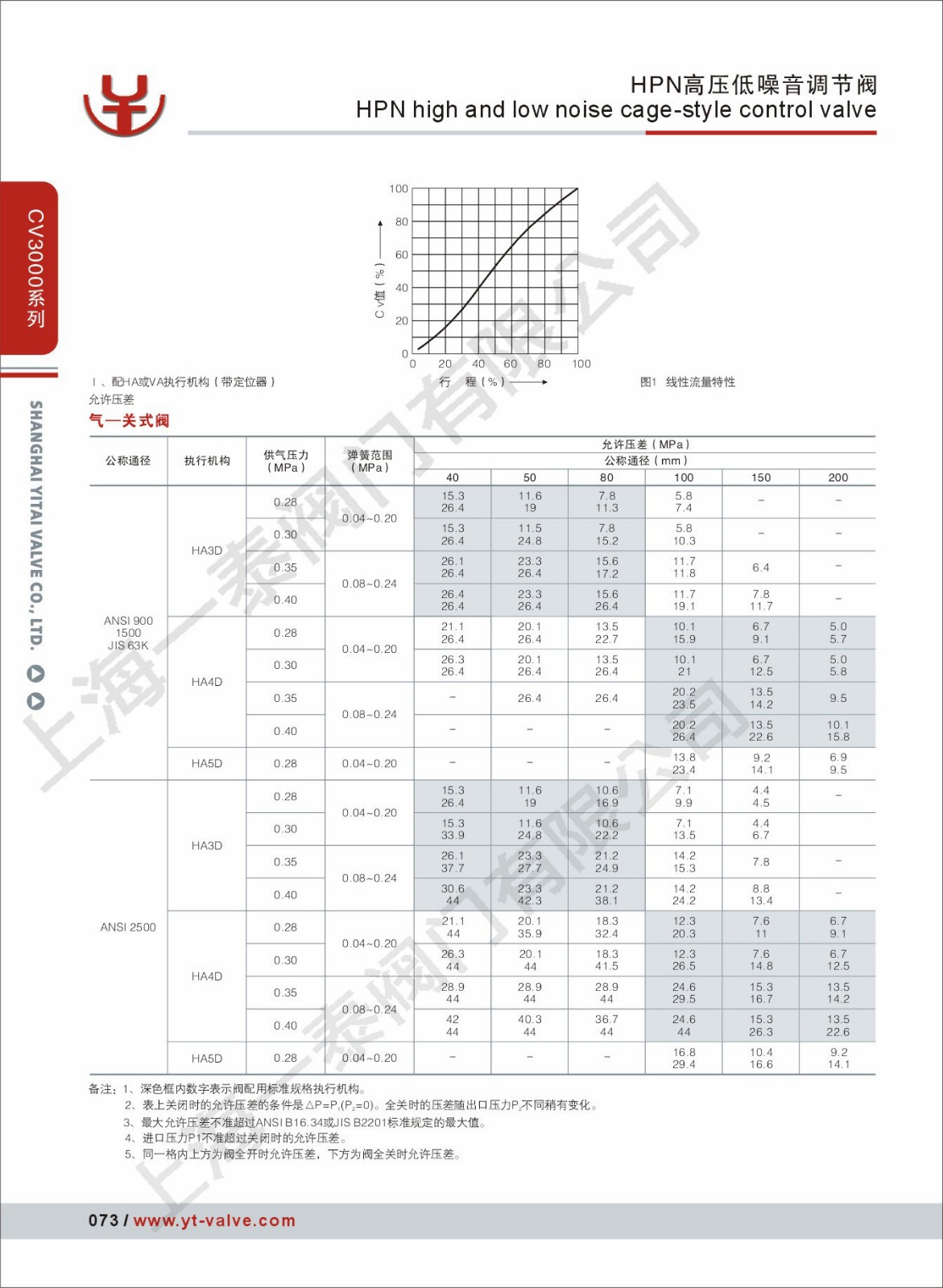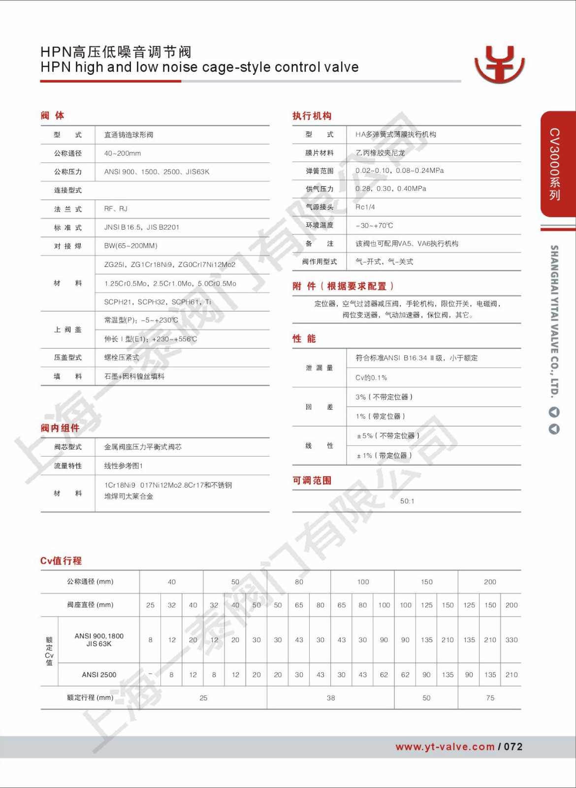 一、HPN高压低噪音调节阀简介: HPN高压低噪声笼式调节阀是一种为降低可压缩流体噪声而设计的压力平衡式调节阀,为适应气体的节流扩散与膨胀,套筒上设有许多对称小孔来 降低压力降,比HHPC高压笼式阀噪声低。阀体结构紧凑,流体通道呈S流线型,压降损失小,流量大。调节阀配用多弹簧式薄膜执行机构,结构紧凑,输出力大。上海一泰阀门有限公司生产的HPN高压低噪声笼式调节阀在工业系统的广泛应用中取得高质量的控制效果和经济效益。二、HPN高压低噪声笼式调节阀特点:1、结构简单、体积小、重量轻。2、阀体设计新颖,阀容量大、流阻小。3、粗壮的阀杆及一体化的阀芯,能承受高负载而阀芯不致脱落。4、同一规格的阀门可作成有多种KV值,只要更换阀芯就可实现。5、额定流量系数大,在相同通径的条件下流能能力增大30℅左右6、按流体力学低流阻原理,设计的线性直通阀体,具有相等的内部横截面积,压降损失小,流体流动平稳。相等的阀体壁厚额定流量系数增大30℅。可降低阀体重量。三、HPN高压低噪声笼式调节阀工作原理: HPN高压低噪声笼式调节阀符合国际IEC标准。通过接受调节仪表来的直流电流信号,改变被调介质流量,使被控工艺参数保持在给定值。同时具有可靠的动作性能,精确的流量特性,可调范围大,阀座泄漏量小,操作稳定。