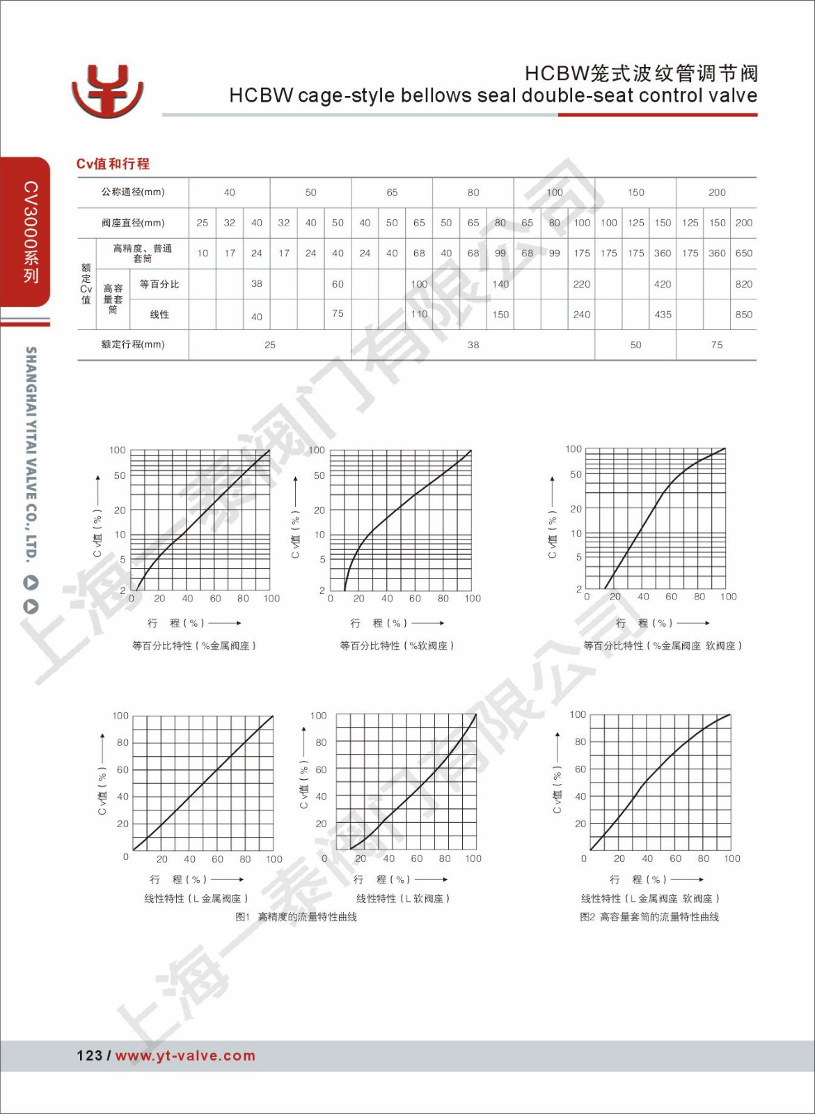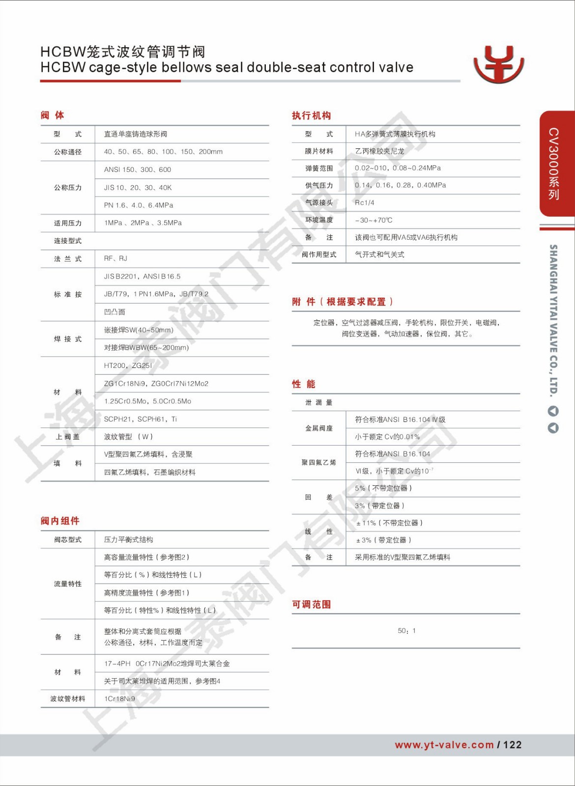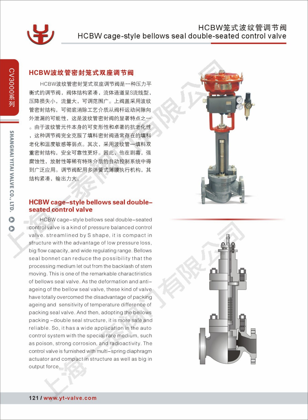 一、HCBW笼式波纹管调节阀简介: HCBW笼式波纹管调节阀配用多弹簧薄膜执行机构,是一种压力平衡式的调节阀。HCBW笼式波纹管调节阀阀体结构紧凑,流体通道呈S流线型的,具有压降损失小,流量大,输出压力大,可调范围广等优点。上阀盖采用波纹管密封结构,可彻底消除工艺介质从阀杆运动间隙向外运动的可能性,这是波纹管密封阀的显著特点之一。由于波纹管元件本身的可变性和卓著的抗老化性,这种调节阀完全克服了填料密封阀通常存在的调料老化和温度敏感等弱点。其次采用波纹管一填料双重密封结构,安全可靠性更好。因此他在剧毒,强腐蚀性,放射性等稀有特殊介质的广泛应用中取得高质量的控制效果和经济效益。二、HCBW笼式波纹管调节阀特点:1、欧系精装、控制精确、密封性好、设计先进、品质优良2、技术精湛、结构优越、流动平稳、响应迅速、替代进口3、压降损失小、输出力稳定、流量系数大、通道光滑截面相等4、设定点可调且范围宽,便于用户在设定范围内连续调整;5、膜片式执行机构较气缸式机构检测精度高,动作灵敏;6、阀内采用压力平衡机构,使调节阀反应灵敏、控制精确、允许压差大。7、阀体按流体力学原理设计的等截面低流阻流道,额定流量系数增大30%。8、调节切断型采用软密封结构阀芯,达VI级泄漏标准(零泄漏)。9、伺服放大器采用深度动态负反馈,可提高自动调节精度。。10、流体对阀芯作用方向都处于流开状态.故阀能稳定工作。11、执行机构采用多弹簧结构.高度减少30%、重量减轻30%。三、HCBW笼式波纹管调节阀工作原理: HCBW笼式波纹管调节阀就是以压缩空气为动力源,以气缸为执行器,并通过阀门定位器、电磁阀、转换器、等组合件去带动阀门,实现开关量或比例式调理,接纳工业自动化操控系统的操控信号来完结调节管道介质的:流量、压力、温度等。HCBW笼式波纹管调节阀的特点就是操控简略,反应快速,且实质安全,不需别的再采纳防爆办法。