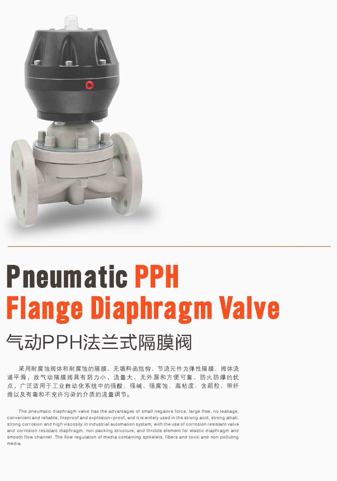 上海一泰阀门有限公司生产的气动PPH法兰式隔膜阀采用耐腐蚀的阀体和耐腐蚀的隔膜、无填料函结构、节流元件为弹性隔膜、阀体流道平滑,故气动隔膜阀具有流量大、无外漏和方便可靠、防火防爆的优点,广泛适用于工业自动化系统中的强酸、强碱、强腐蚀、高粘度、带纤维以及有毒和不允许污染的介质的流量调节。