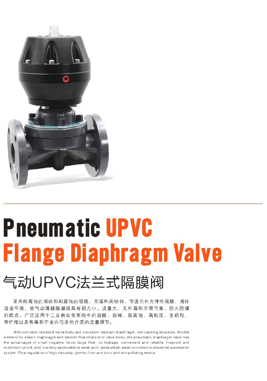 上海一泰阀门有限公司生产的气动UPVC法兰式隔膜阀采用耐腐蚀的阀体和耐腐蚀的隔膜、无填料函结构、节流元件为弹性隔膜、阀体流道平滑,故气动隔膜阀具有流量大、无外漏和方便可靠、防火防爆的优点,广泛适用于工业自动化系统中的强酸、强碱、强腐蚀、高粘度、带纤维以及有毒和不允许污染的介质的流量调节。