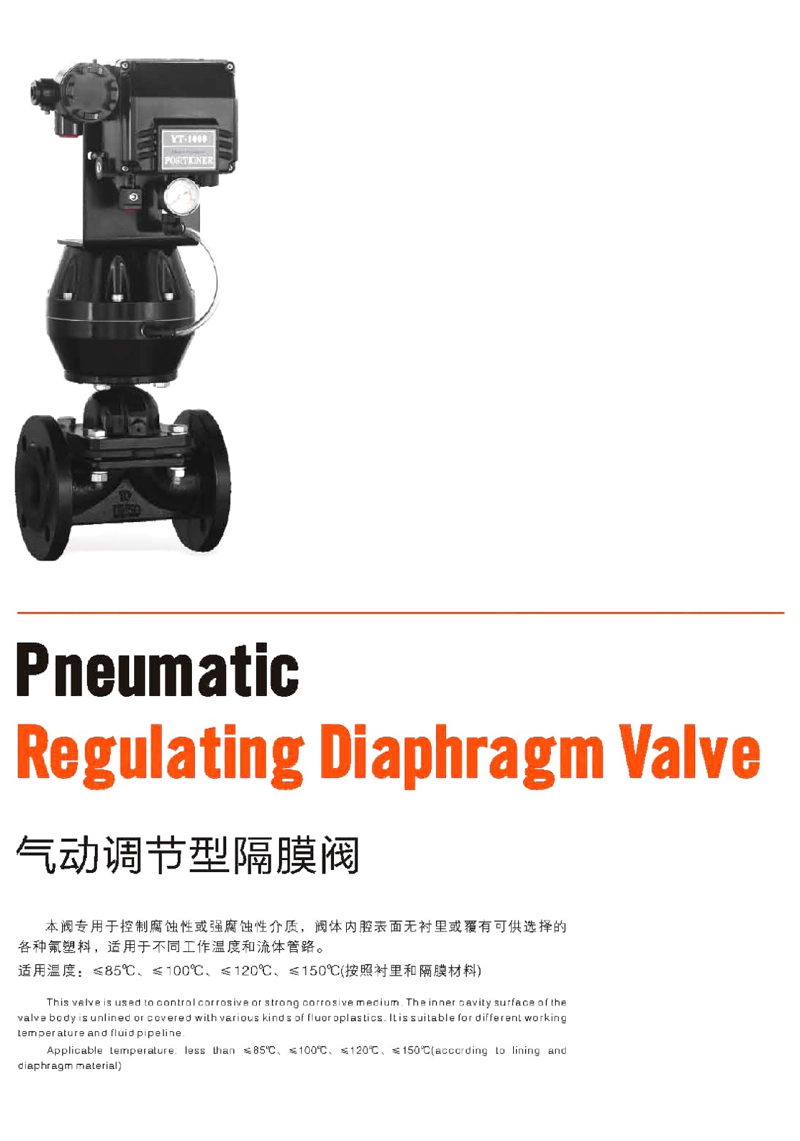 上海一泰阀门有限公司生产的气动调节型隔膜阀专用于控制腐蚀性或强腐蚀性介质,阀体内腔表面无衬里或覆有可供选择的各种氟塑料,适用于不同工作温度和流体管路。