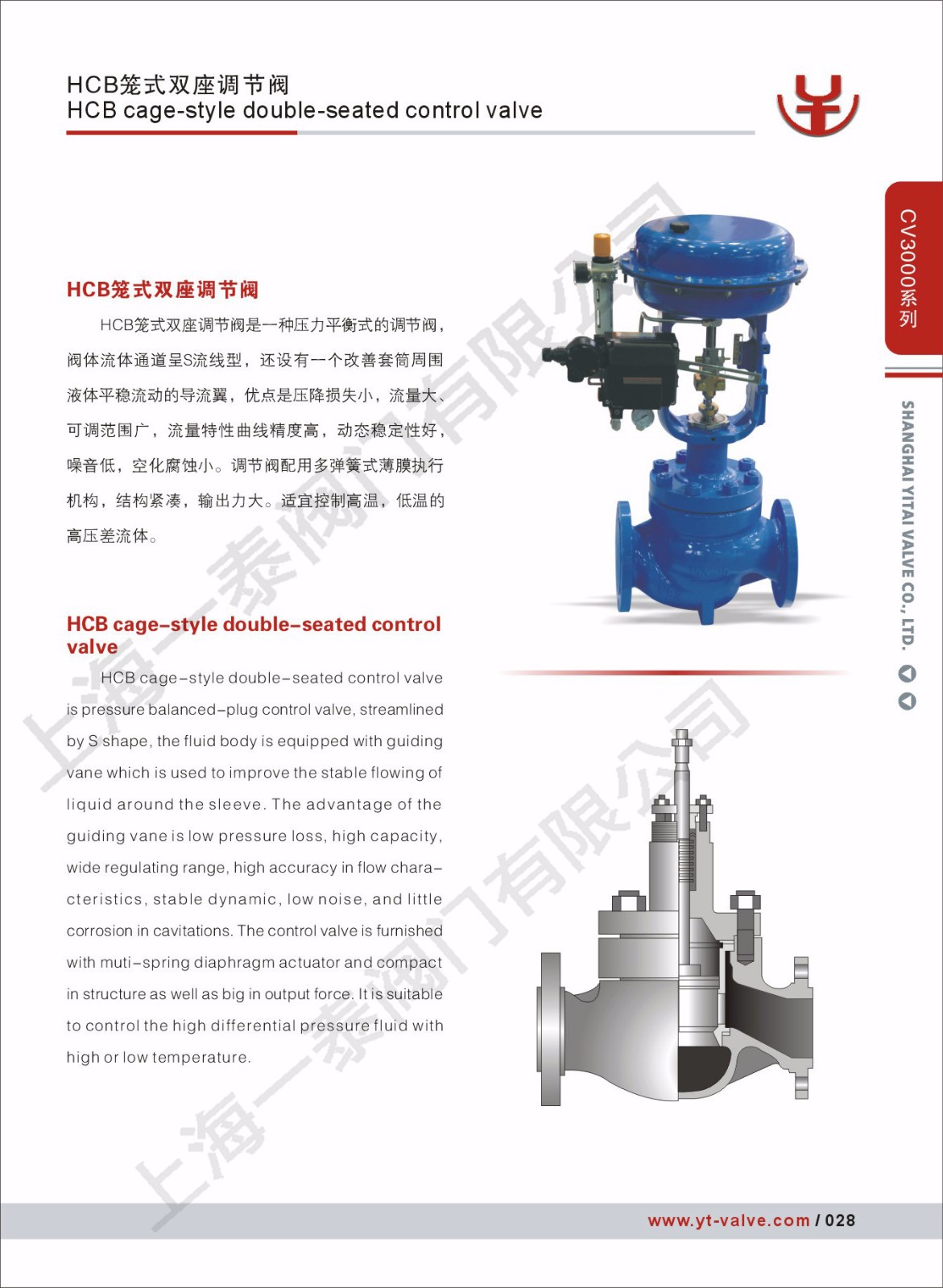 HCB笼式双座调节阀是压力平衡式调节阀,阀内流体通道呈S流体线型,还设有一个改善套筒周围流体平稳流动的导向翼,优点是压降损失小,流量大,可调范围广。流量特性曲线精度高,动态稳定性好。噪音低,空化腐蚀小,调节阀动态稳定性好、噪音低、防空化,适宜控制各种温度的高压差流体。配用LHA多弹簧薄膜执行机构或电动执行机构,其结构紧凑、输出力大。产品符合GB/T4213-92。。
