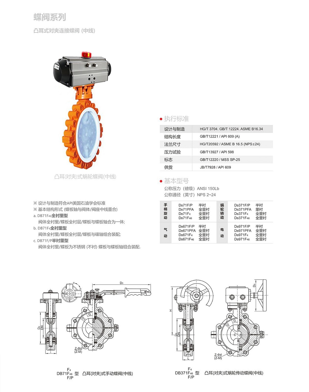 上海一泰阀门有限公司生产的气动凸耳式对夹连接蝶阀(中线)设计与制造符合API美国石油学会标准,其中,全衬里型为阀体全衬里,蝶板全衬层,蝶板与蝶板轴合为一体或组合装配,半衬里型为阀体全衬里,蝶板为不锈钢(不衬)蝶板与蝶板轴组合装配。